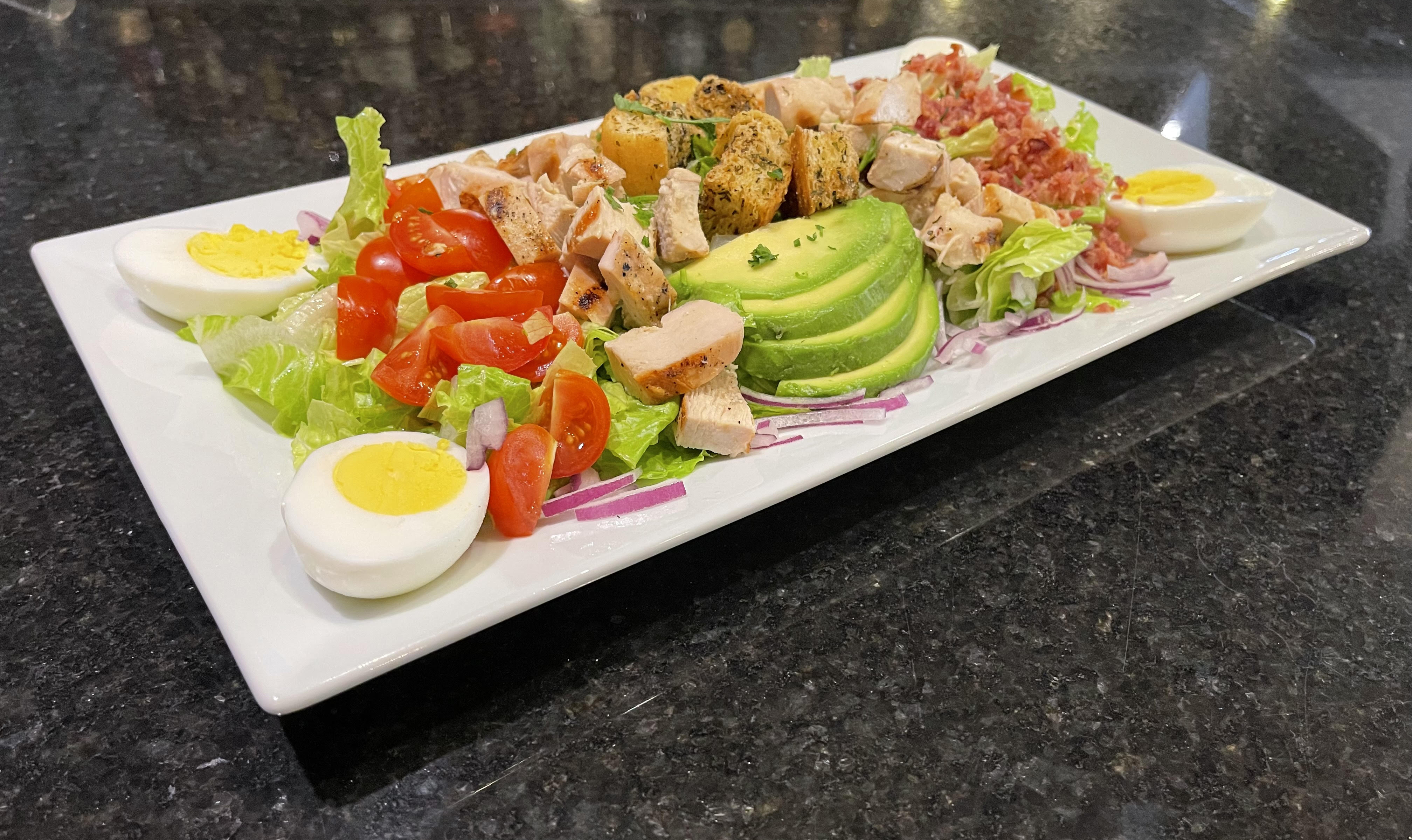 Crisp Romaine tossed lightly with Caesar dressing topped with shredded parmesan & pecorino romano cheese, cherry tomatoes & seasoned croutons 9 Add grilled or blackened chicken breast 6 Add grilled or blackened Atlantic salmon filet 8 Add filet medallions 8